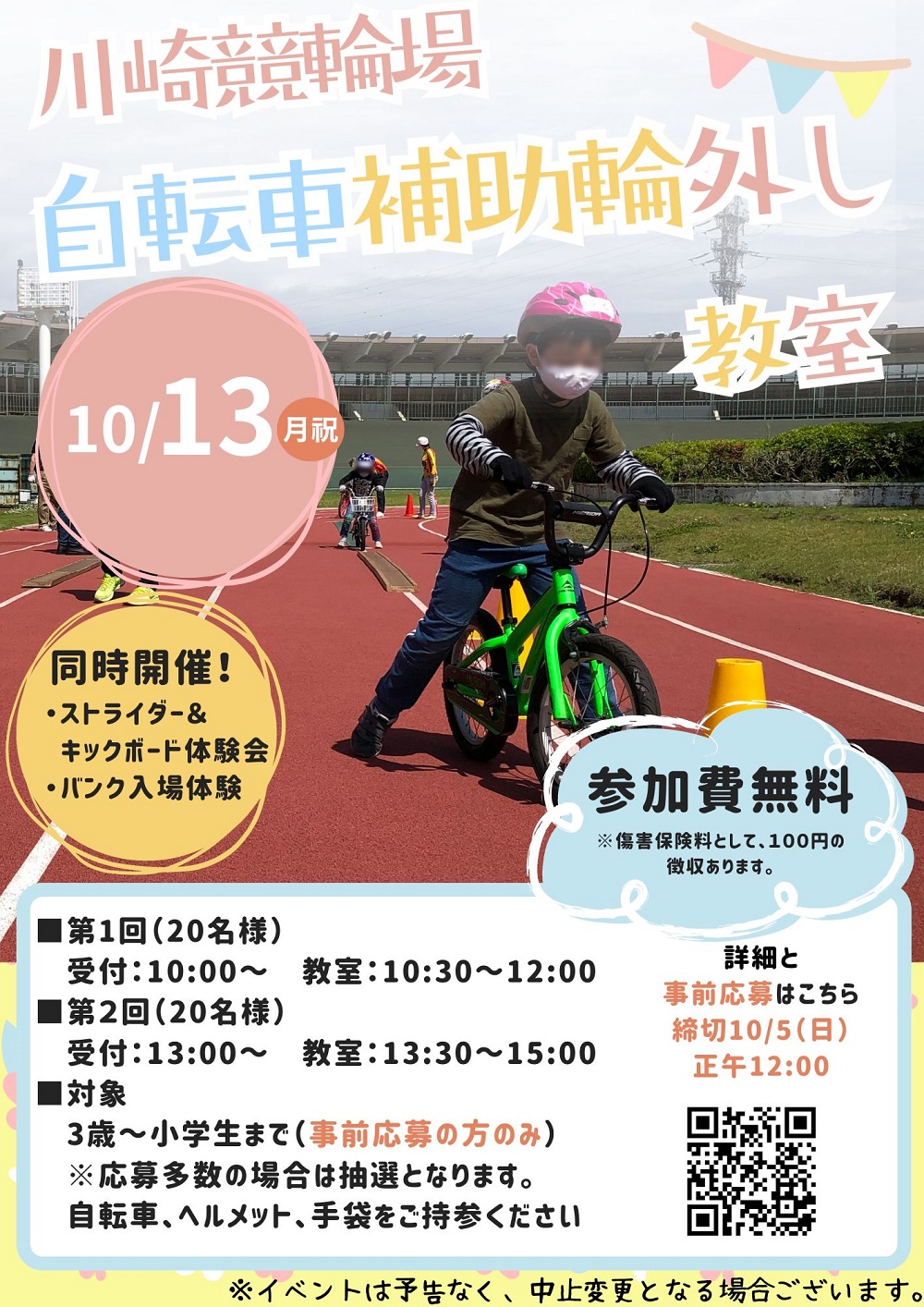参加費 | :無料※自転車補助輪外し教室のみ傷害保険料100円徴収あり。 |