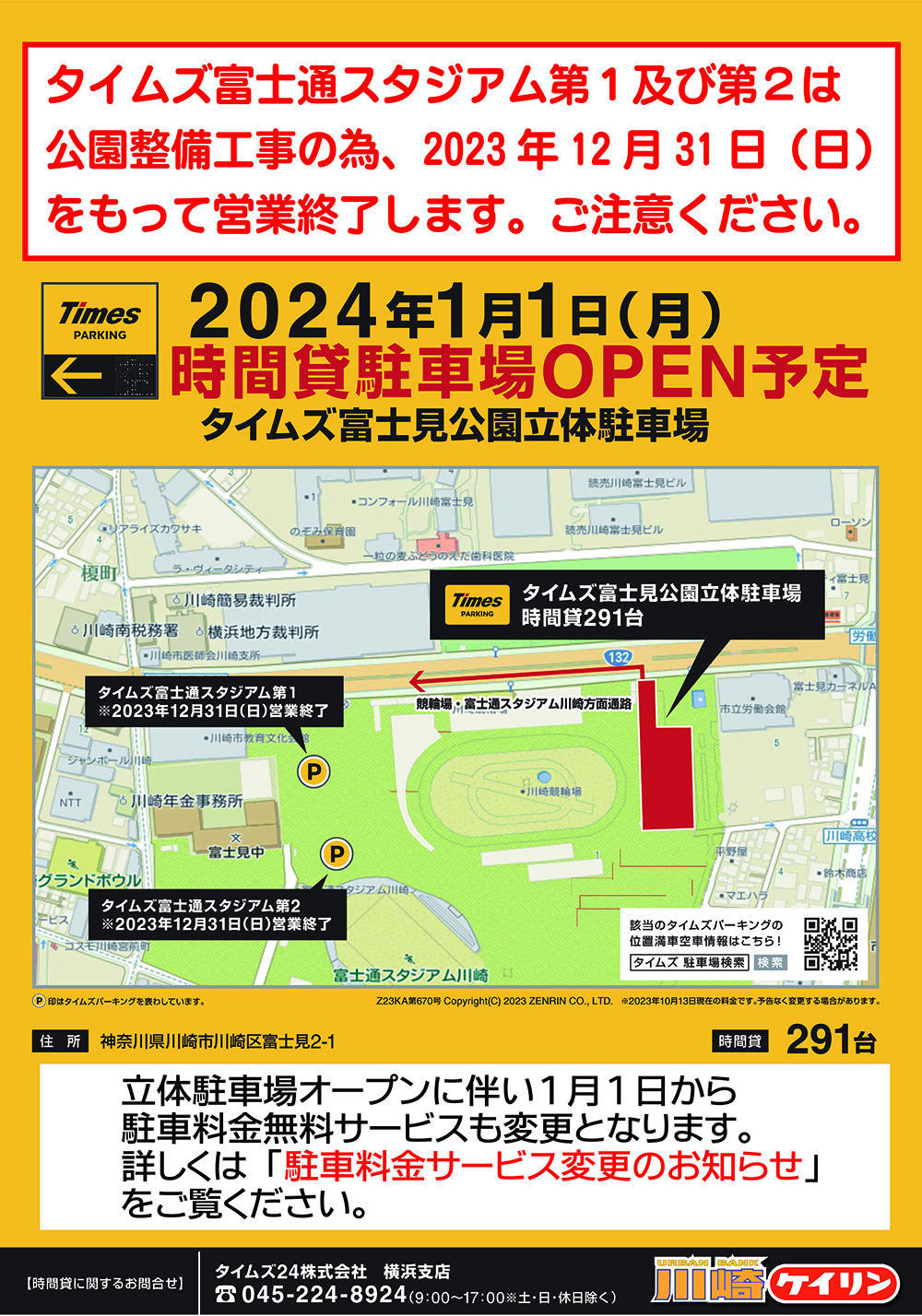 川崎競輪場正門側の「タイムズ富士通スタジアム第1及び第2駐車場」は、富士見公園再整備工事の為、2023年12月31日(日)をもって営業終了となります。