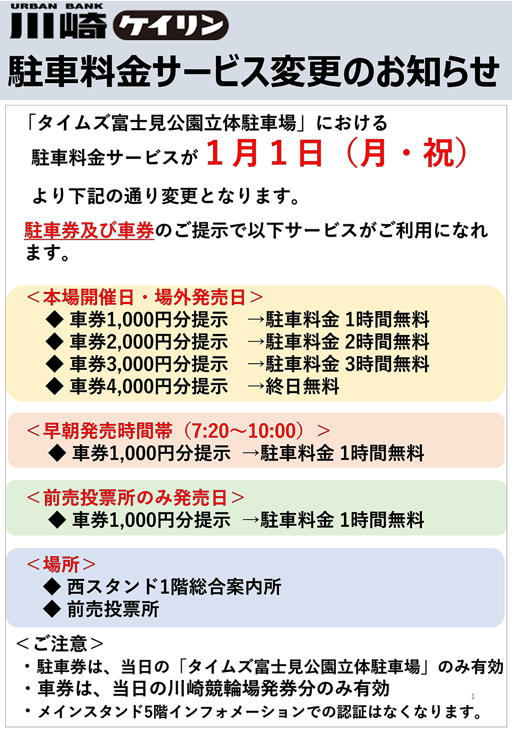 1月1日以降、駐車場をご利用のお客様は、競輪場最寄りとなる「タイムズ富士見公園立体駐車場」をご利用下さい。