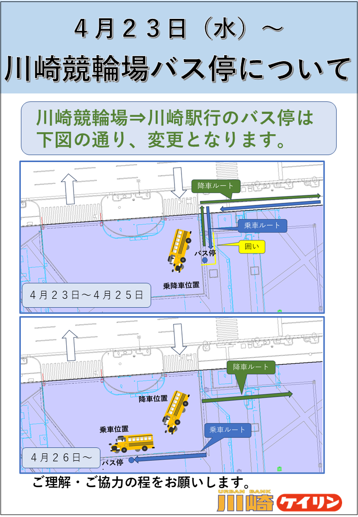 4月23日(水)から川崎競輪場⇒川崎駅のファンバスのバス停は下記ポスターの通り、変更となります。 ご理解・ご協力の程をよろしくお願いします。